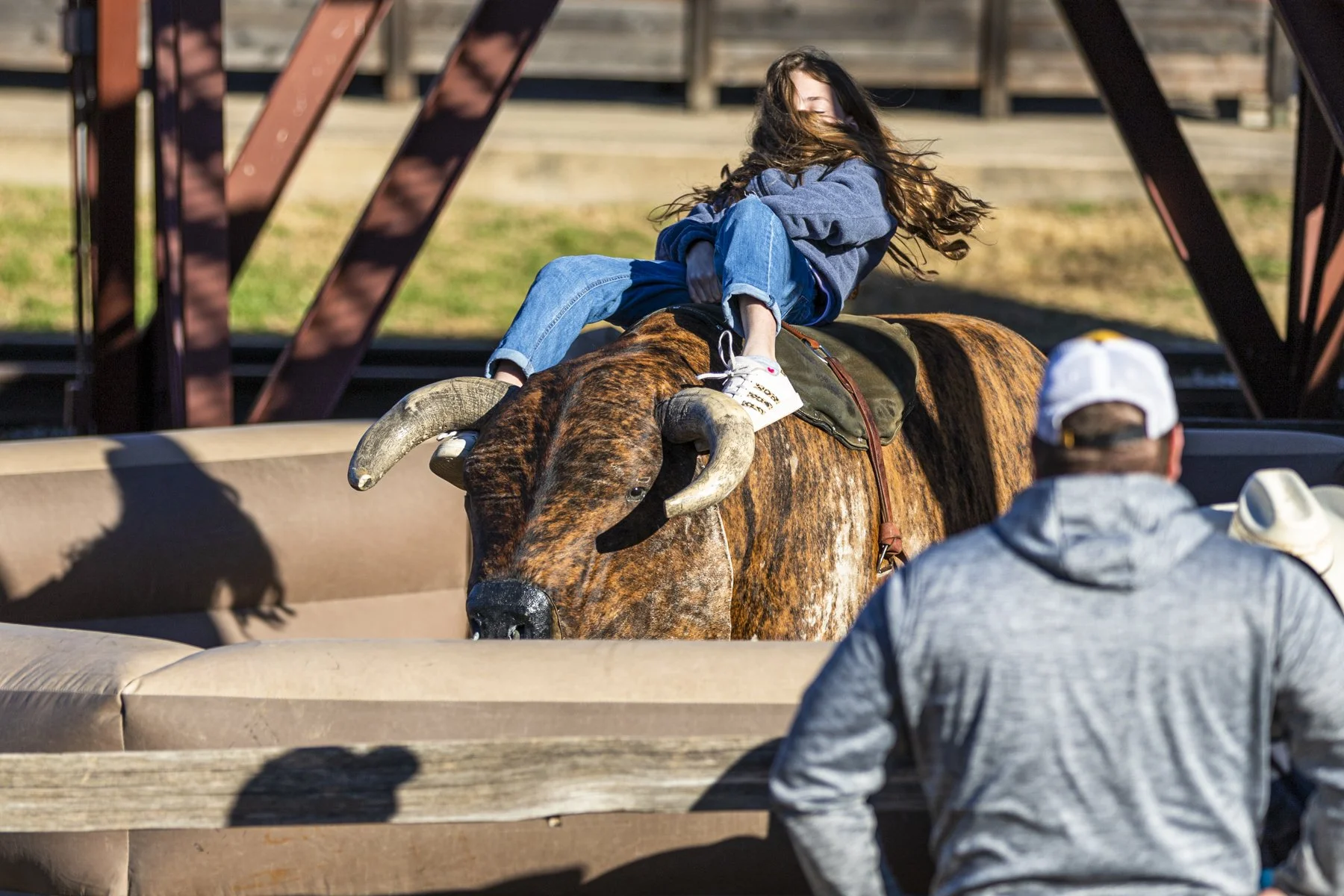 A young lady trying to ride the mechanical bull.