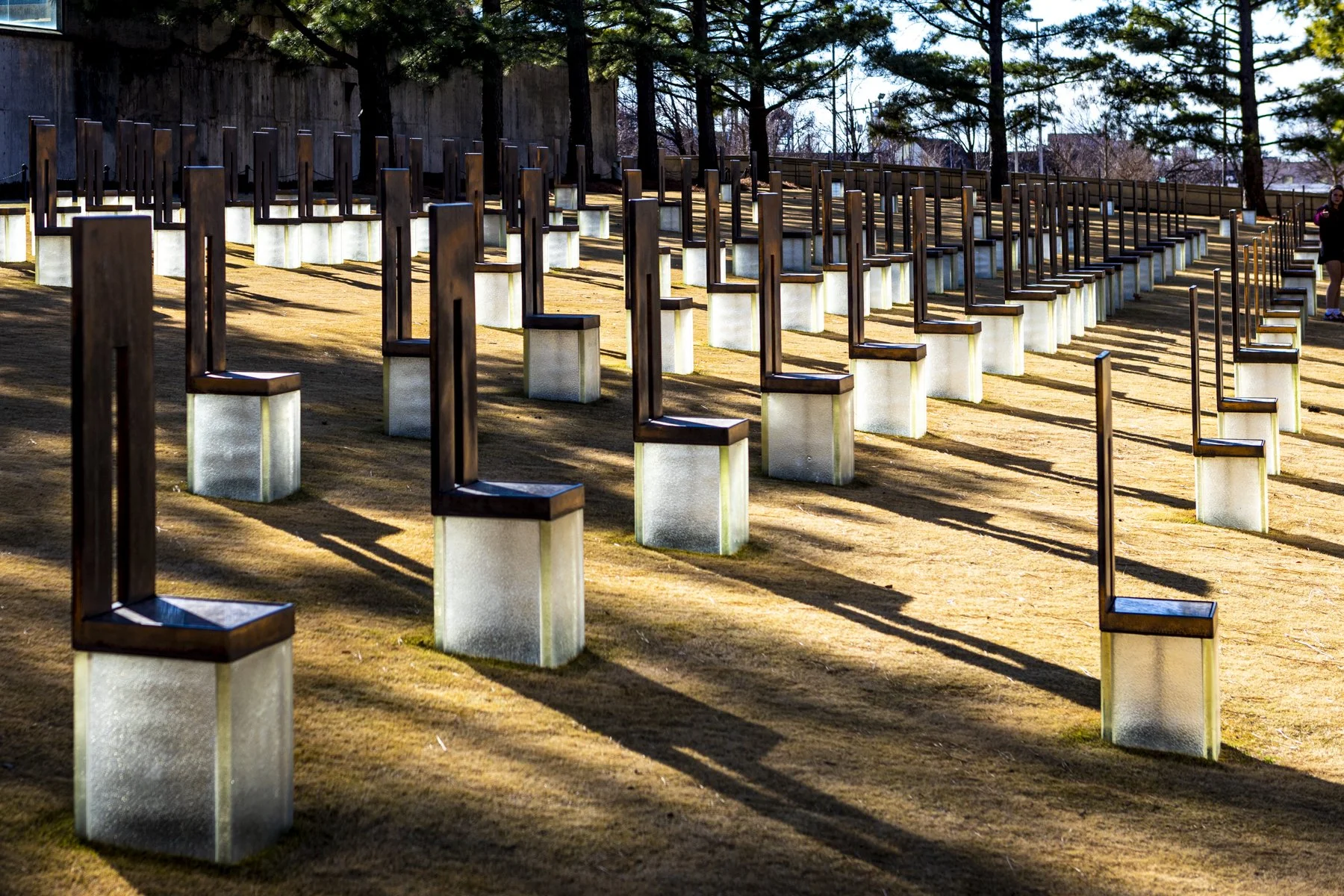 - Field of Empty Chairs – Located where the Murrah Federal Building once stood, the chairs are arranged in nine rows that reflect the floor where those who were killed were working or visiting. Each of the 168 chairs is etched with the name of a person killed. The 19 smaller chairs represent the children. The chairs light up as beacons of hope at night.